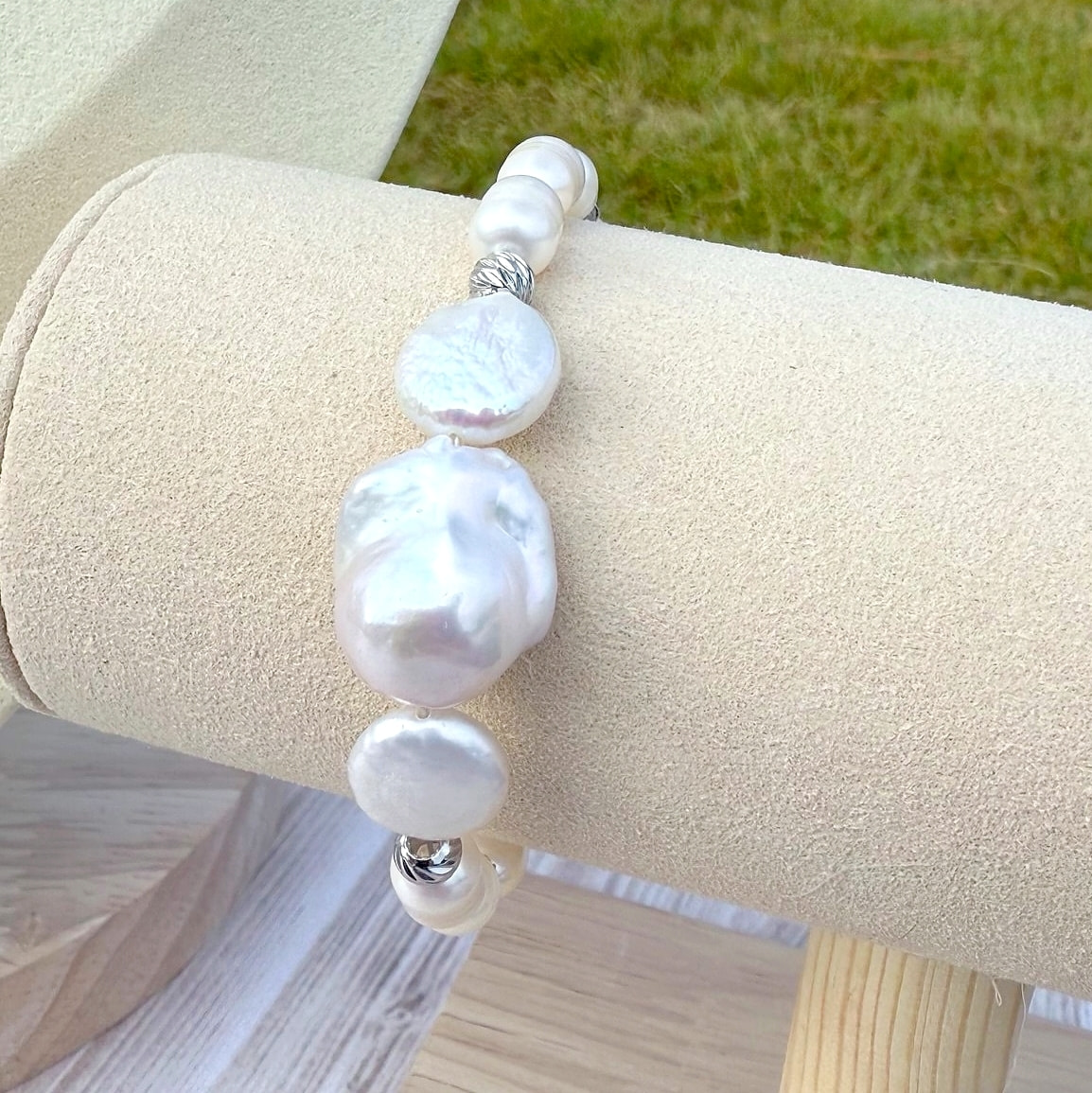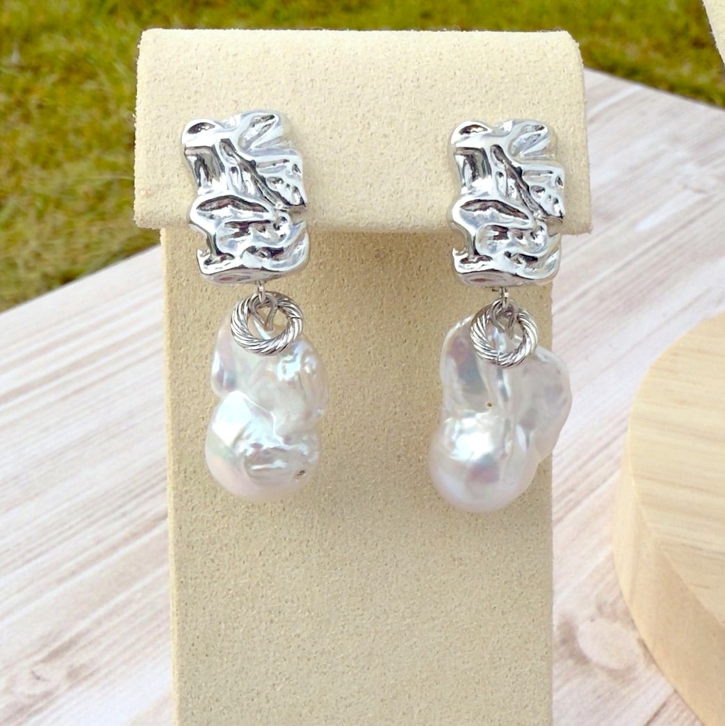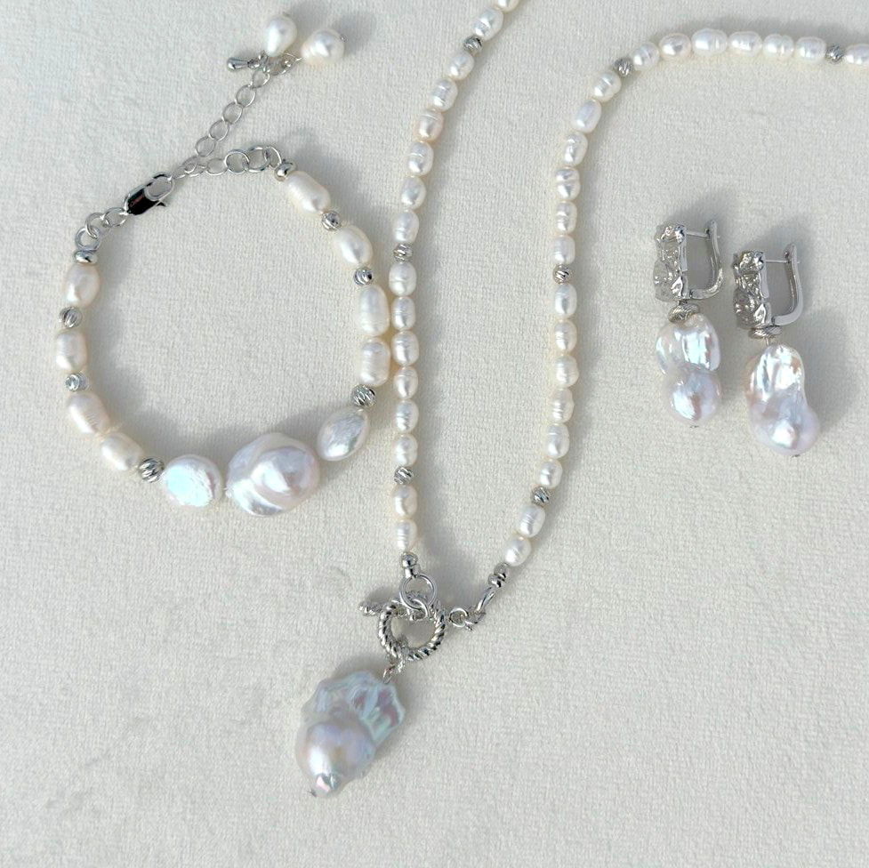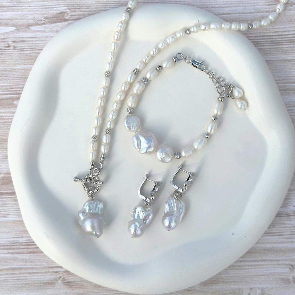 Этот комплект — как отражение луны в воде. Жемчуг хранит её нежный свет, жемчужинки в виде капелек - мягкость воды, серебристая фурнитура — блеск ночных звёзд.