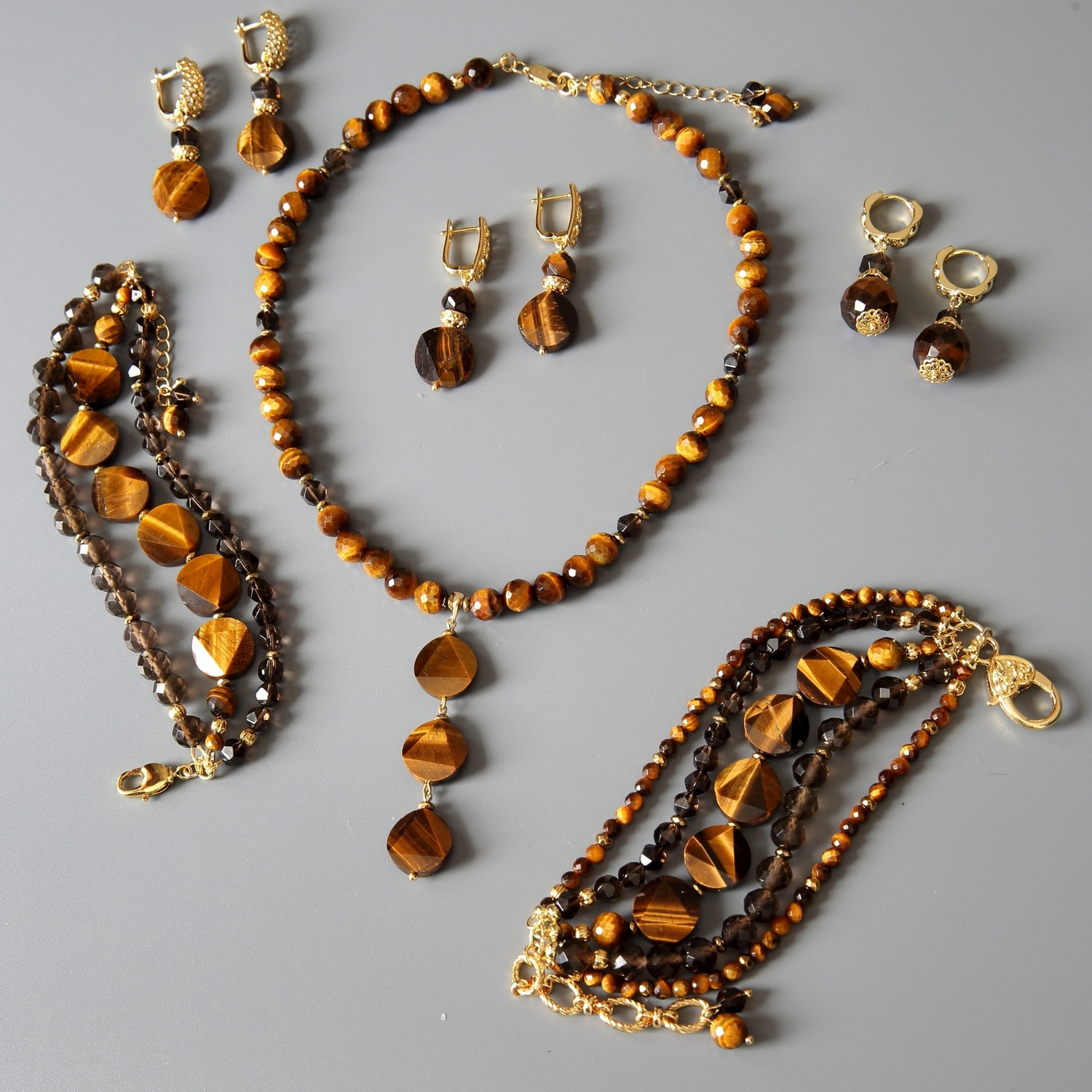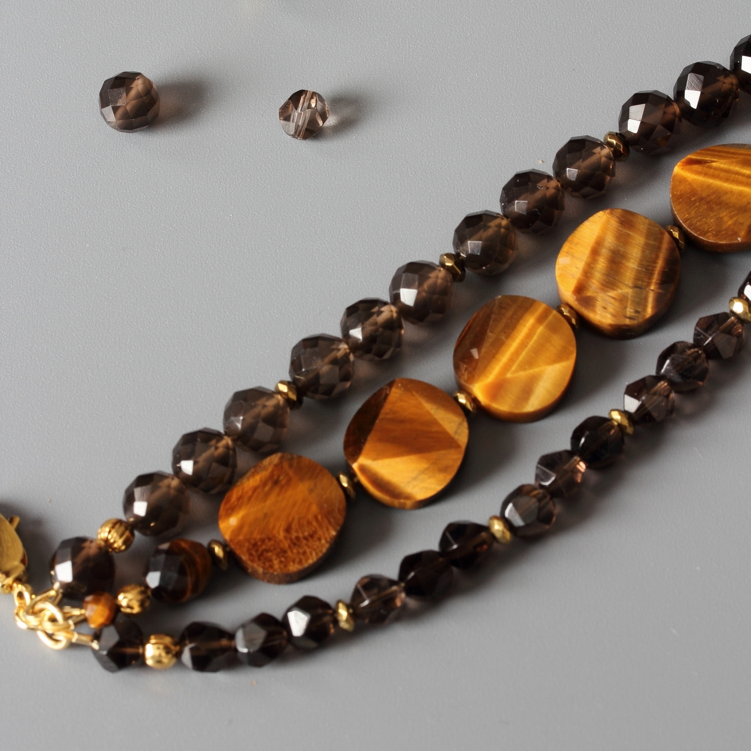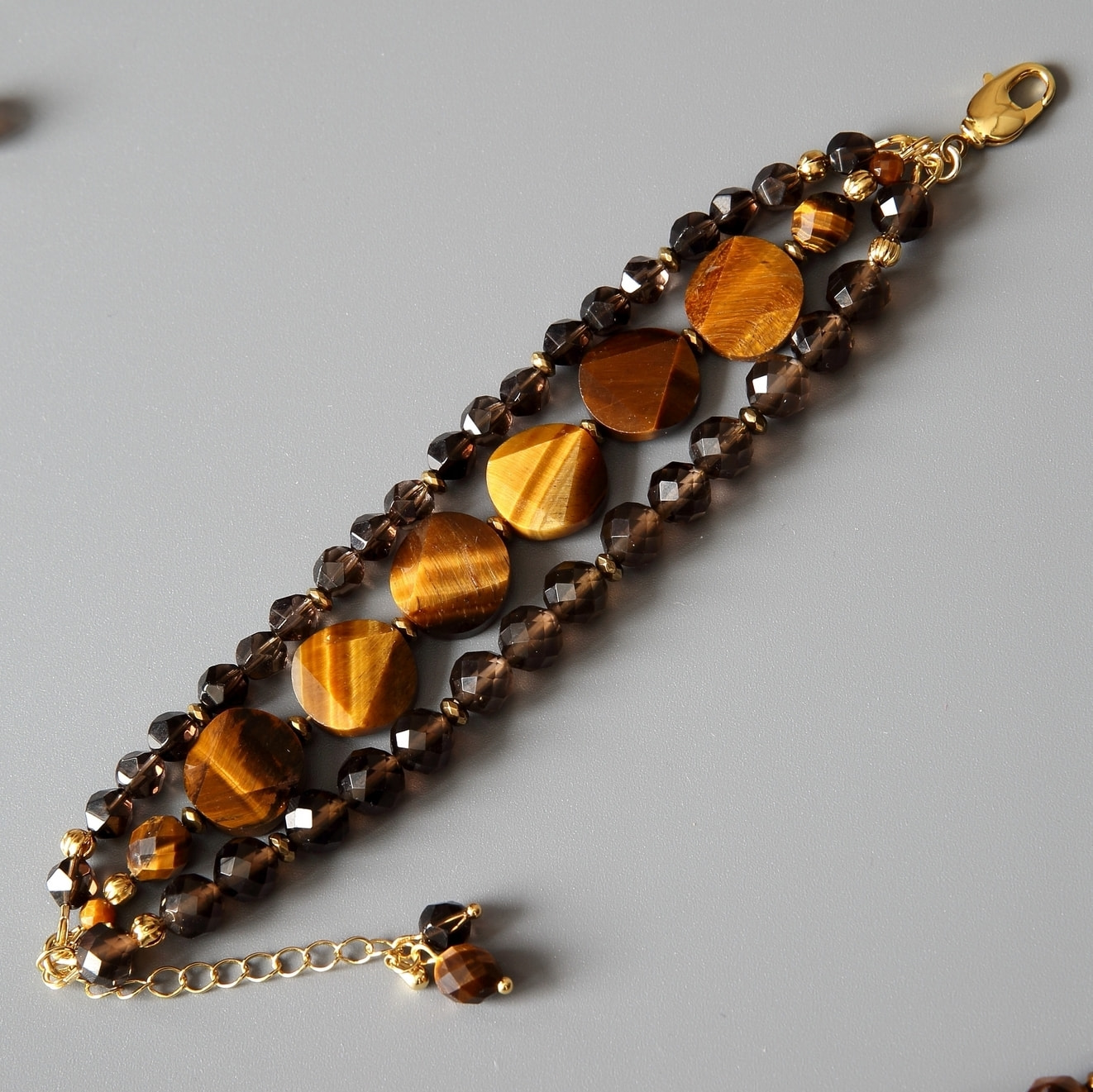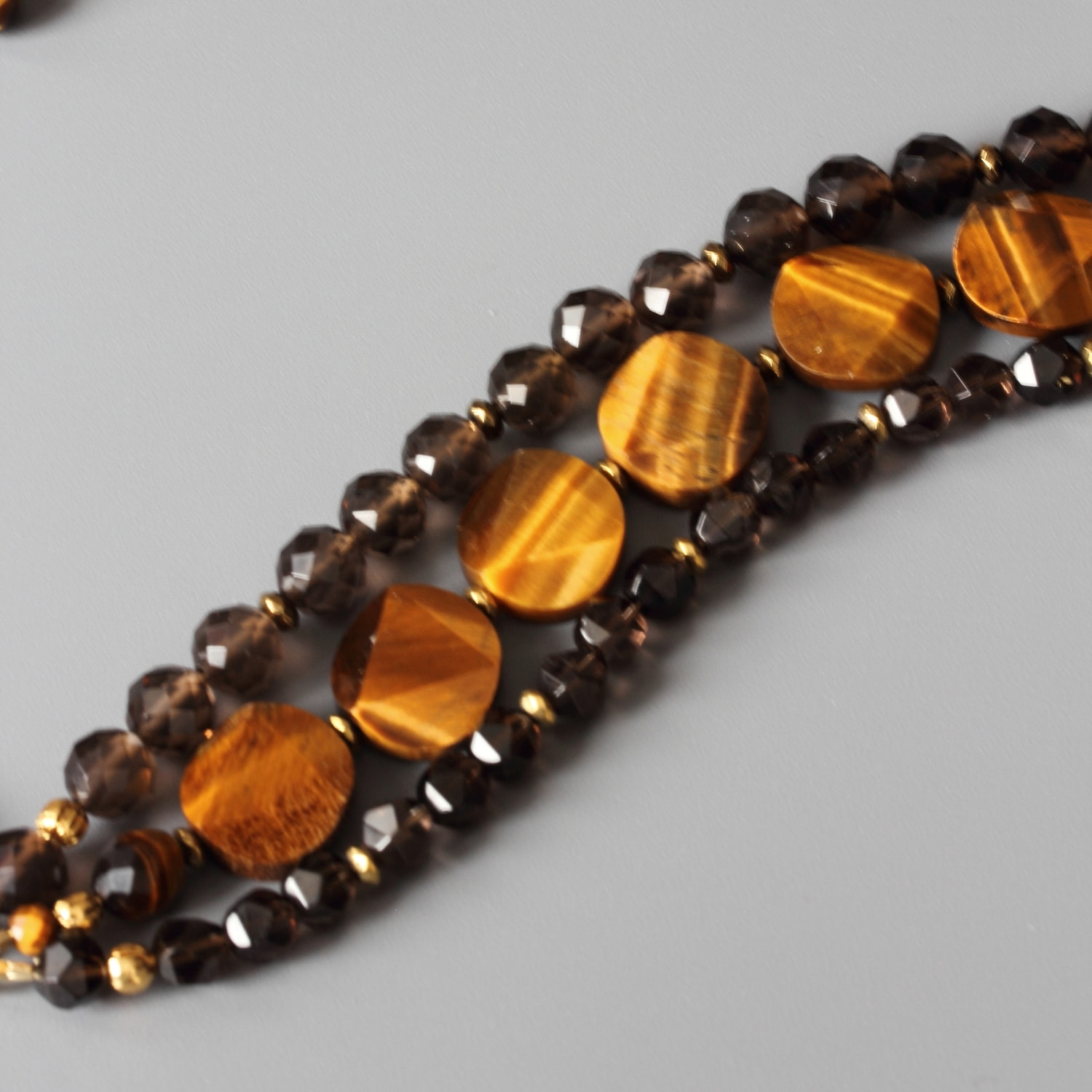Многорядный женский браслет из натурального тигрового глаза и раухтопаза (дымчатого кварца).