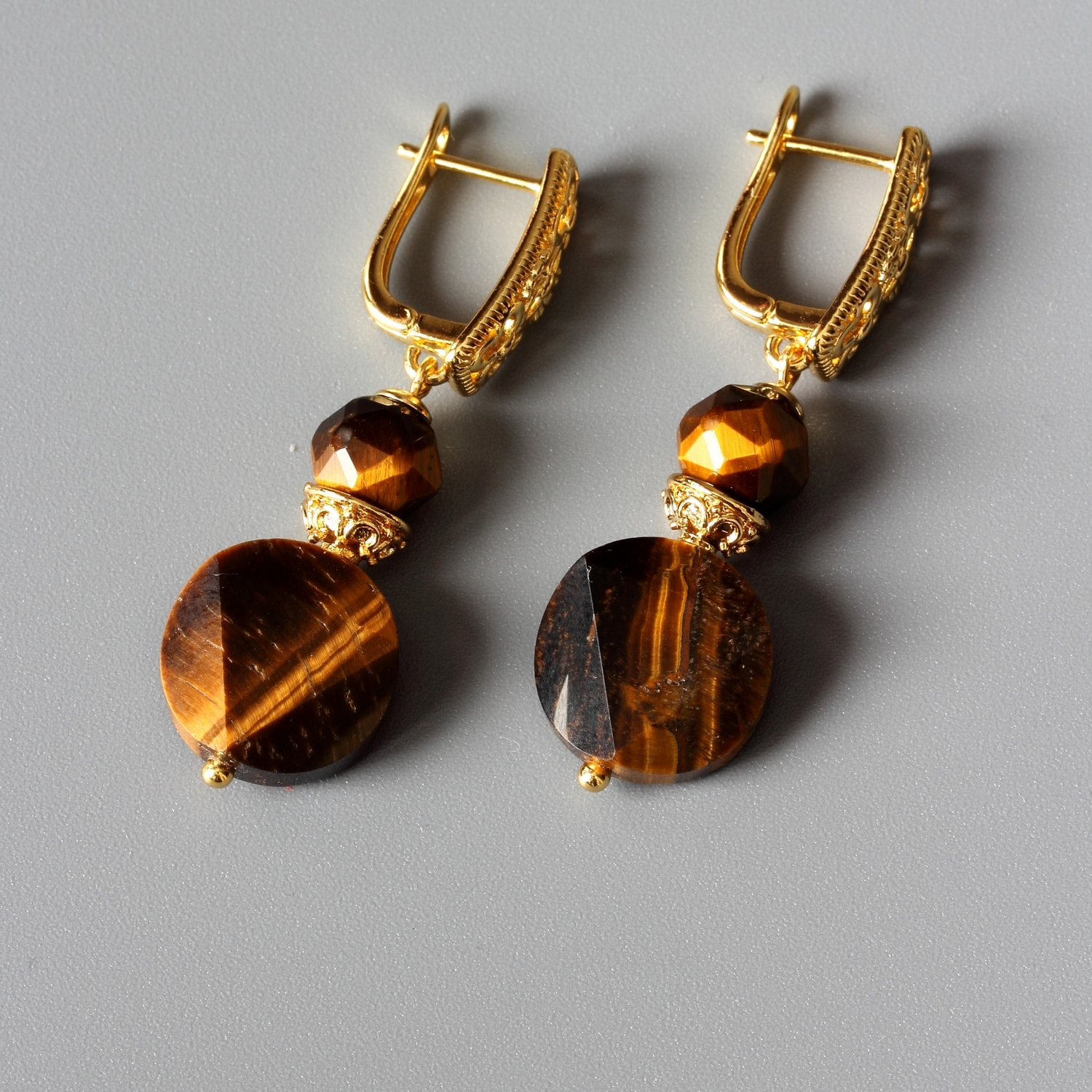 Лёгкие, выразительные серьги женские из натурального тигрового глаза и раухтопаза (дымчатого кварца).